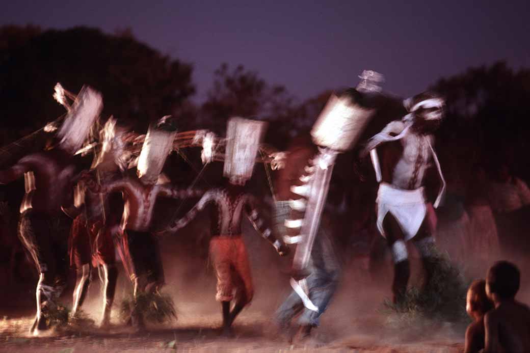 Boys dancing the “Aeroplane Dance” depicting the crash of an American bomber near Borroloola during the Second World War. Some of the crew survived and was rescued by local Aborigines.