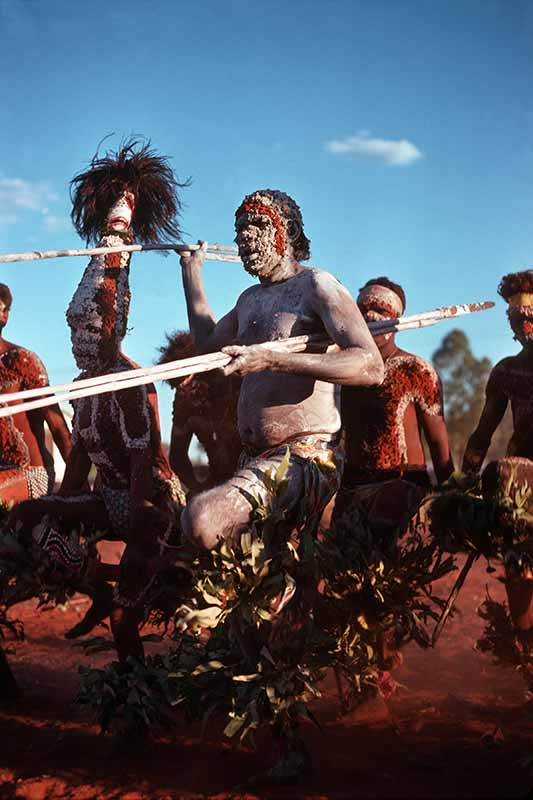Warlpiri men perform the “Jurntu” traditional dance in Lajamanu. This dance depicts a strange recurring dream of one of the men, acted out by the dancer carrying spears.