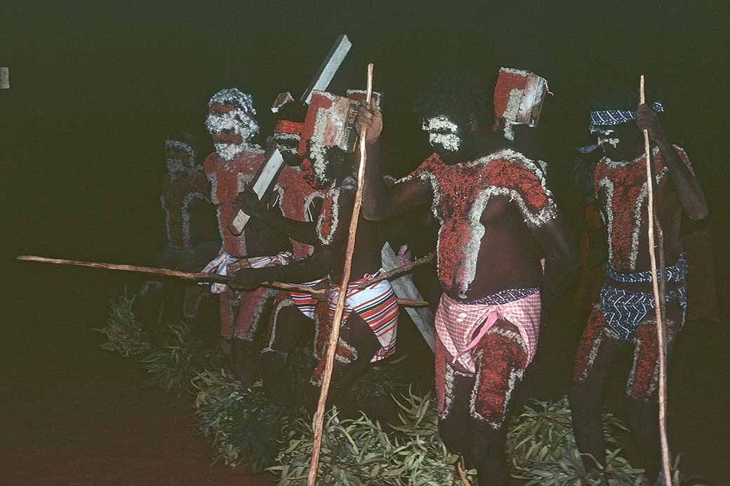 Jesus carrying the cross at the “Easter Purlapa”, depicting the Easter story as a traditional Aboriginal corroborree.