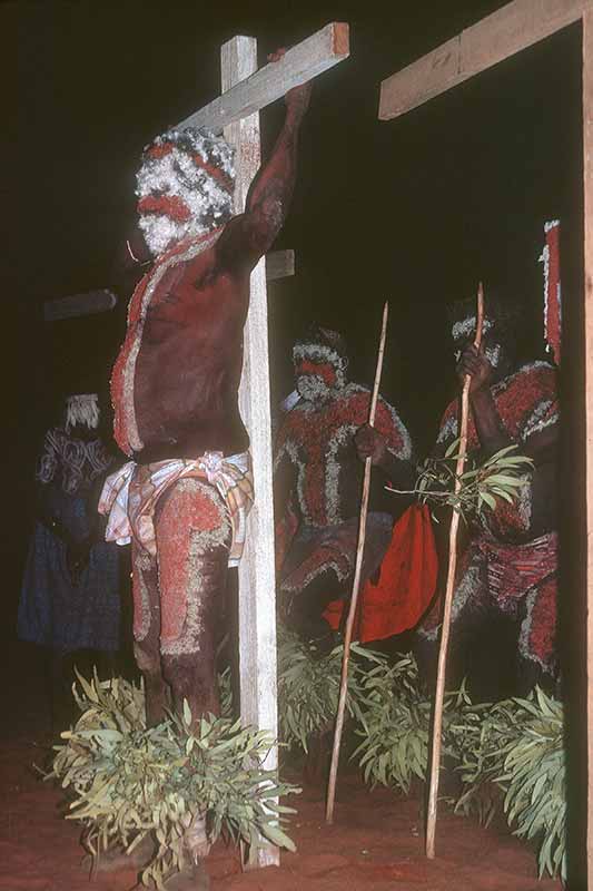 Jesus on the cross at the “Easter Purlapa”, an attempt to combine Christianity with traditional Aboriginal dancing, depicting the Easter story as a traditional Aboriginal corroborree.