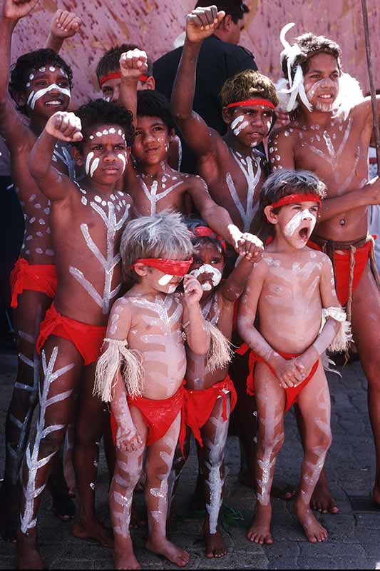 The Aboriginal dance group “Wakka Wakka”, an enthusiastic group of young boys from Cherbourg, after their performance at the Festival of Pacific Arts in Townsville.