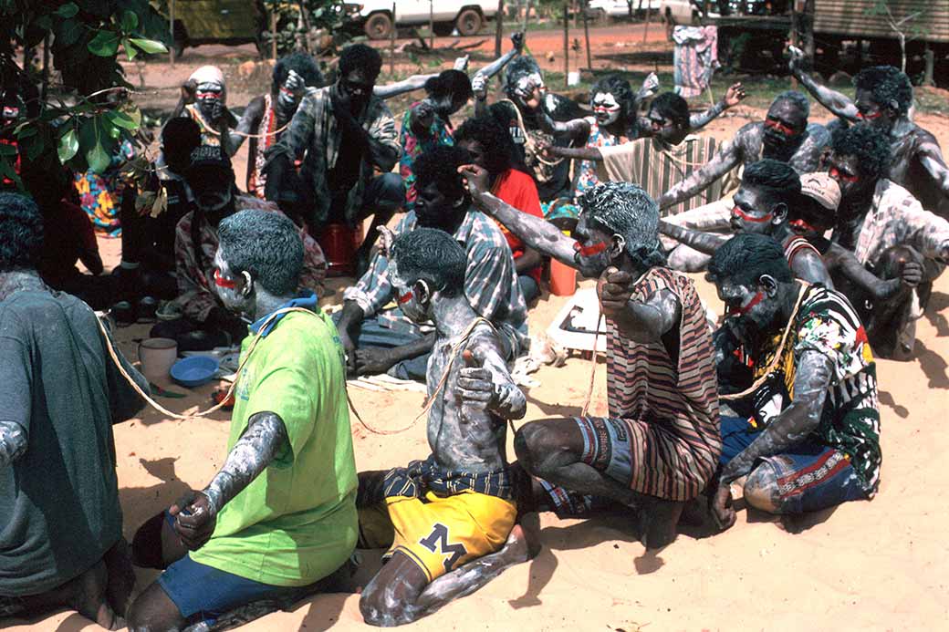 Participants during the rituals of the “Djapi” initiation ceremony flap their arms and imitate the cries of the “brolga”, a large water bird, in Numbulwar.
