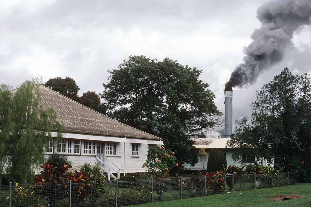 A “Queenslander” house and the smoking chimney of the sugar mill in the sugar town of Gordonvale.