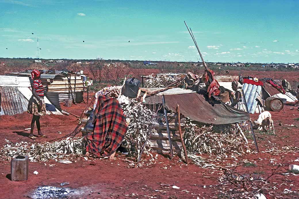 Mingkirri Camp with its “humpies”, improvised living places of family groups in Lajamanu as it was in 1975. Many people actually preferred to live in camp, rather than in houses: in the old days they always lived like this, only the materials have changed.