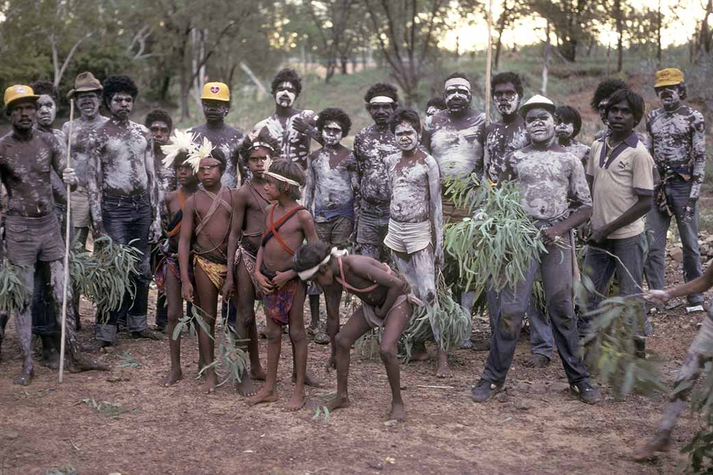 The “daru” (initiates) pose with the men and boys who will accompany them to the ceremonial ground at the start of an all-night ritual. The men are painted with clay and carry gum leaves.