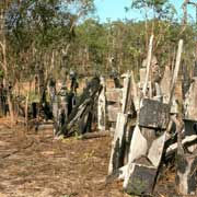 Inland is Pickertaramoor, the centre of a forestry project. There is a lovely waterfall here, but a better for swimming is Taracumbie Falls, with an excellent pool. On day trips from Darwin, tourists may be taken there after visiting Nguiu (now Wurrumiyanga) on Bathurst Island and the Pukumani burial site at Paruwu. These Pukumani poles, unique to the Tiwi, are like totem poles, carved and painted in many colours, each with different meanings according to each clan who has commissioned them. These poles are placed around the grave, to commemorate the deceased and prevent his spirit from entering the camp again.