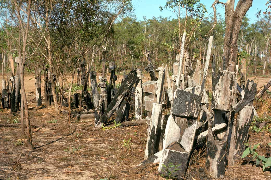 “Pukumani” funerary poles are left in the bush after the ceremonies and are gradually destroyed by white ants or, as here, by a bushfire near Milikapiti (Snake Bay), on Melville Island.