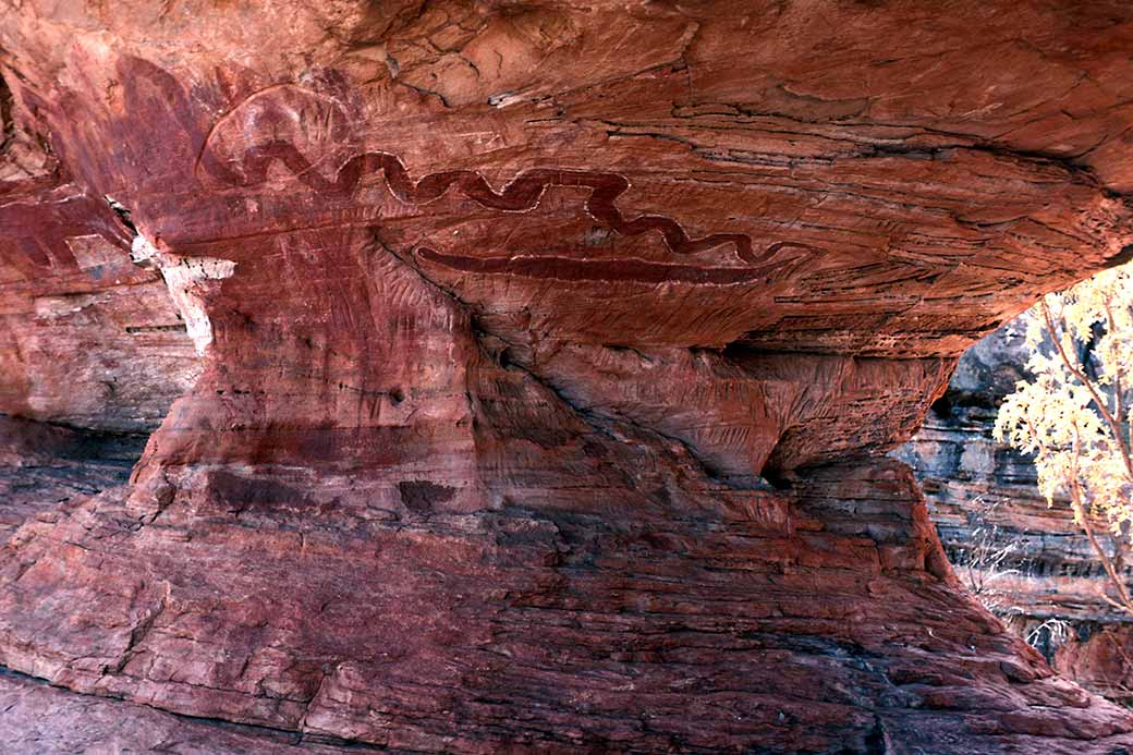 “Garrimalan”, the Rainbow Serpent, a very important figure in Aboriginal mythology, painted on the rocks at what is now known as the Nganalam Art Site in Keep River National Park, to the west of Timber Creek on the border with Western Australia.