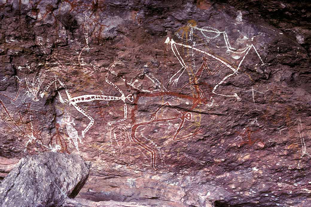 “Mimi Spirits”, who are supposed to live in rocks, are important in the mythology of the Gagudju people, the traditional owners of Kakadu. These are depicted hunting with spears, at the Anbangbang Art site in Burrungguy, Nourlangie Rock.
