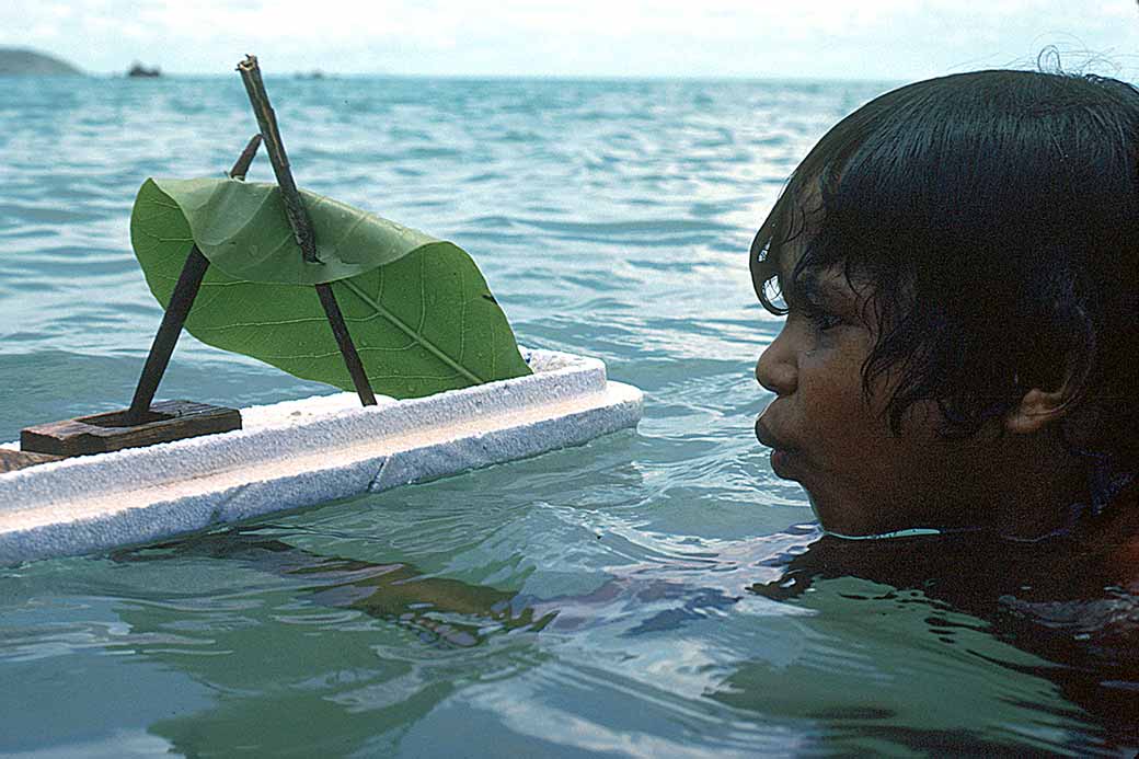 A boy from the Torres Strait playing with his improvised sailing boat off the beach on Thursday Island.