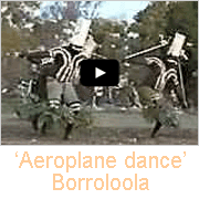 Borroloola, just south of the Gulf of Carpentaria; it is the centre of the Yanyuwa Aboriginal people. In the year 1943, during the Second World War, an American bomber crashed in country to the east and the crew was found by local people. This event is depicted in song and dance in the "Aeroplane Dance"; it was made into a film fifty years later. The first evening young boys could dance, while the sound was being recorded and the following day the men were filmed.