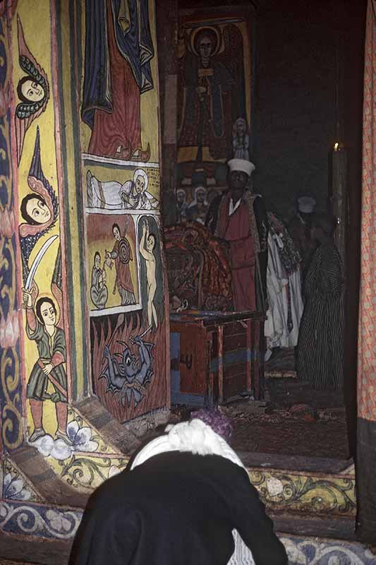 A woman bows to the “Holy of Holies”, the inner chamber where the “Tabot”, a replica of the Arc of the Covenant is kept; only priests and monks are permitted to enter.