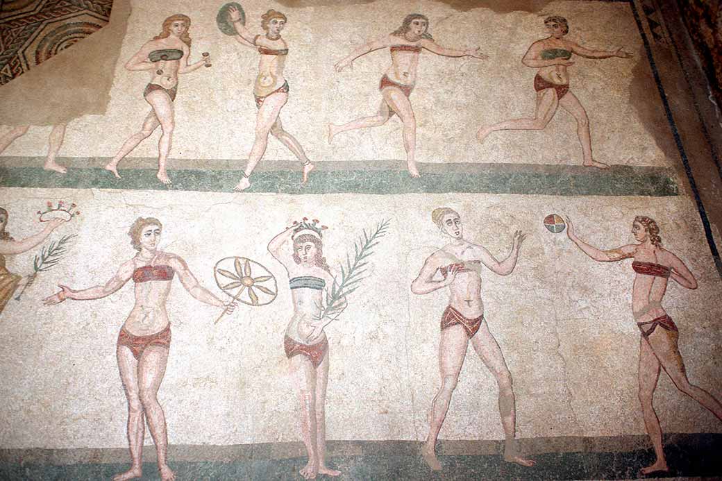 A mosaic on the floor of the room dubbed the “Chamber of the Ten Maidens” (Sala delle Dieci Ragazze), excavated in 1959-60. Informally called “the bikini girls”, the maidens appear in a mosaic artwork which scholars named Coronation of the Winner. The young women perform sports including weight-lifting, discus throwing, running and ball-games. A woman in a toga at far left is depicted with a crown in her hand; one of the maidens holds a palm frond.