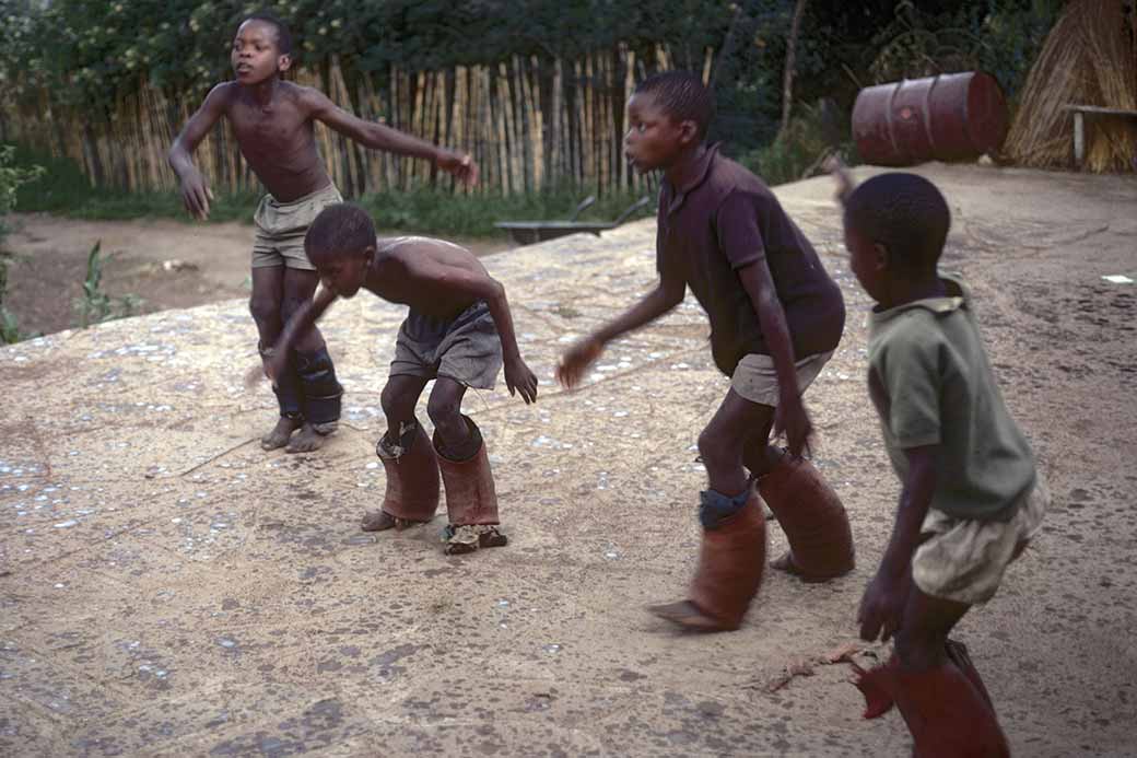Boys performing a “Liphotha” or “Gumboot” dance in Ha Mafefoane, a village about 4 kilometres from Roma and 40 kilometres east of Maseru. They are wearing rubber leggings, like gumboots, which they slap to a rhythm.