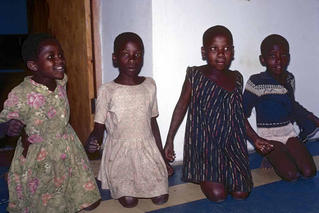 Girls sing and perform a “Mokhibo” dance on their knees in a house in the village of Ha Mafefoane village.
