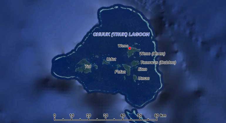 Chuuk (formerly Truk) Lagoon is a large atoll in the making, with a protective reef, 225 kilometres around, enclosing a natural harbour with an area of 2,130 km². In the lagoon are eleven significant islands with a total land area of 93 km² and a population of around 36,000. The main island is Weno (formerly Moen) with the largest town in the FSM, also called Weno; it has almost 14,000 inhabitants and is the capital of the State of Chuuk that also includes the outer island groups to its north, west and south. Mount Tonaachaw (229 metres) rises behind the town and to its east is Wichon Falls on the Wichen river.