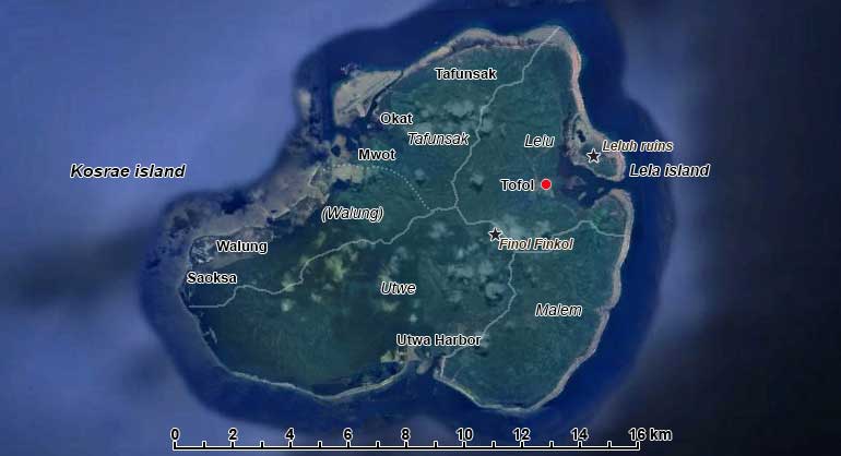 Kosrae is the easternmost of the Caroline Islands in the Federated States of Micronesia and its smallest State. It has a land area of 111.3 km² and a population of around 6,600. It was formerly known as Kusaie or Strong’s Island, and there are a few nearby islands and islets, including the inhabited Lelu Island, where also the ancient Leluh ruins are situated. Opposite that small island is the State’s capital, Tofol, in Lelu municipality; the island is now subdivided into four municipalities: Lelu, Tafunsak (including Walung), Utwe and Malem. The official language is Kosraean, but English, the official language of the FSM, is widely used.