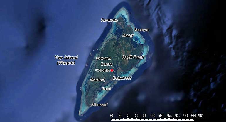 Yap or, in the Yapese language, Wa’ab (now spelled as “Waqab”), is the main island group of the westernmost State with the same name, in the Federated States of Micronesia. The group is made up of four separate islands, separated by narrow channels: Marbaq, Gagil-Tamil, Maap’ and Rumung, surrounded by a common reef. The total area is 308 km² and the population around 11,400. It is the most traditional of the larger Caroline Islands, with its culture very much part of it. The spoken language, Yapese, is now written in a new orthography since 1972 and the modern spelling is used here.