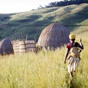 A side road, known as the "Tea Road" leads to tea plantations that were started in the early seventies. There are, as everywhere in the country, small traditional homesteads, houses built of earth and with grass roofs, where maize and other crops are grown and young boys look after their father's cattle. Near Dlangeni is a small, peaceful lake.