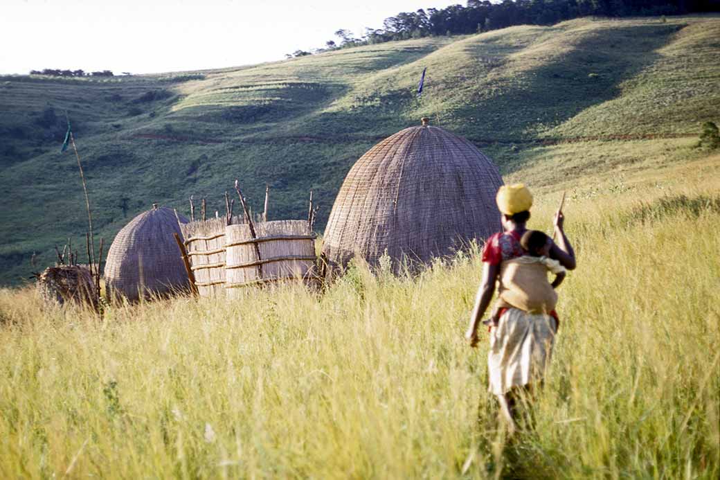 Traditional “Gugqasithandaze”, beehive huts in Malandela. This is also an indigenous “Zionist” church as indicated by the green and blue streamers flowing above them.