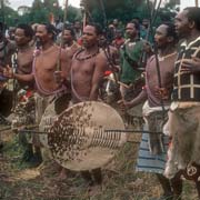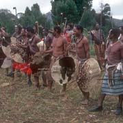 The traditional Swazi wedding of Prince Mfanasibili, one of the sons of King Sobhuza II, was held at Luve, to the north west of Manzini. There was dancing by large groups of married women, recognisable with their "sicolo" beehive hairstyle, all in "sidvwaba" skin skirts, who were joined by the new bride. Young unmarried girls danced, bare breasted, in their short "indlamu" bead skirts, carrying small shields and the young men, carrying large cowhide shields and "sakila" or knobkerrie fighting sticks marched, singing old warrior songs, surging forward, joining the girls; individual men would lope towards a particular girl who was dancing especially well and slam their shield on the ground in front of her, as an appreciation.