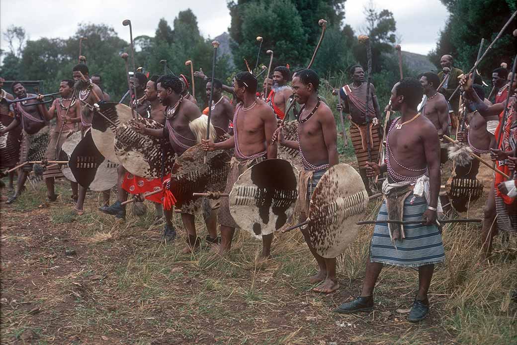 “Emabutfo” (Swazi regiments) dancing after performing the service of cutting and bringing material to build a cattle enclosure in Mangwaneni, a Royal residence near Mbabane.