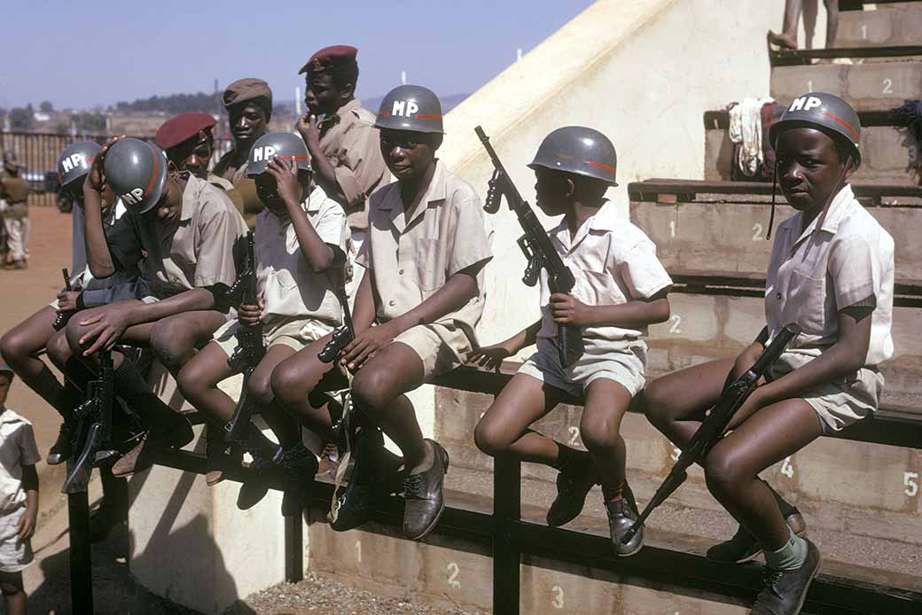 Young boys dressed up as soldiers (or Military Police) during celebrations in Somhlolo Stadium, Lobamba.
