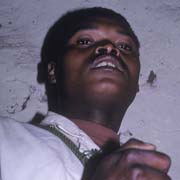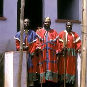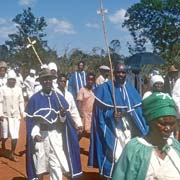 Possibly the "Zionist" Native African church with the most colourful costumes, the Jericho Church was based in the homestead of its Head, Pastor Eliyasi Vilakati, in a village near Mankayane in the west of Swaziland. They wear red and blue robes and often gold coloured crowns, pith helmets or very inventive headdresses of different materials. As in other African churches, their rituals seem to include practices that are also common to those performed by the traditional healers. There were blessings with holy staffs, water that was made holy that could be taken home, possession by the Holy Spirit instead of Ancestral Spirits.