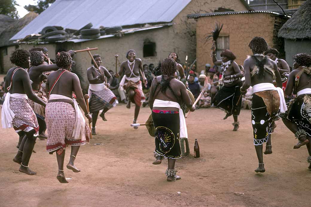 Candidate “tangoma” or diviners dance to the drum rhythms associated with with the “emadloti” or ancestral spirits during their “Kuphotfulwa” or graduation ceremony in LaMabuza's homestead.