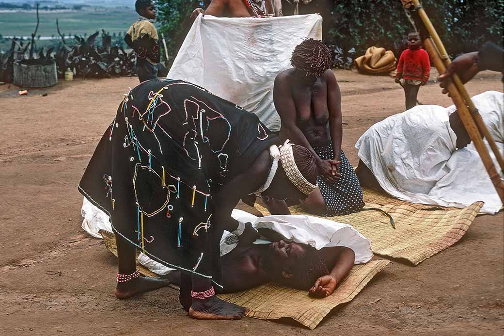 Mhlabazimile Motsa, one of the initiates who has been immersed in the river, “died” and carried back to the village where, to the sound of drums, he is rubbed under the nose with a “sizinga”, a special brush and “resurrected” as a fully qualified “sangoma”.