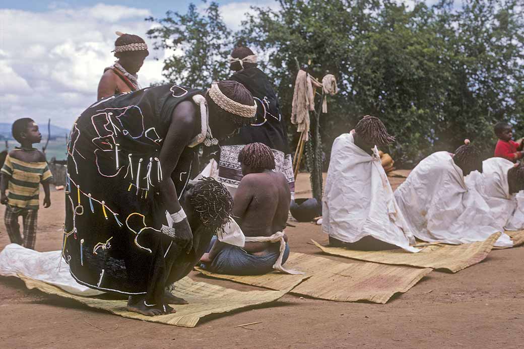 The initiates, who have been immersed in the river and “died” have now been carried back to the village where, to the sound of drums, they are rubbed under the nose with a “sizinga”, a special brush and they then suddenly sit up: “reborn” as a fully qualified “sangoma”.