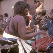 Back in the village, to the unceasing pounding of the drums beating out the "emaNdzawe" rhythm, one of the "bogobela" or senior tangoma lightly brushed the "dead" tangoma under the nose with a "sizinga", a special brush, that brought them "back to life" again, reborn as fully qualified "tangoma" or diviners. The new diviners were then helped into an "umfembi", a device draped around their upper body. This would help them to "smell out" bad sprits that might have entered the bodies of their patients. They then performed a "kufemba" ritual on the people of the village, in which they also carried a "sizinga", a brush that contains, like the "umfembi", magical ingredients; the most important of that is the nose of a hyena: a hyena has a very keen sense of smell and this would help the sangoma to smell out that spirit body.