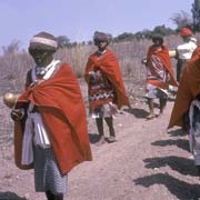 The candidates were then draped in red cloth and the rhythm of the drums changed: this was the rhythm of the emaNdzawe (or Ndau, a people living in Mozambique and Zimbabwe): long ago, a group of Swazis, marauding in the area had come across some cattle belonging to those emaNdzawe; they had been told not to kill those as these cows were reserved to be offered to the ancestral spirits. The Swazi ignored this, killed the cattle and also killed those people daring to oppose them. Since that time the emaNdzawe spirits haunted them and need to be placated in these ceremonies. They were led out of the village towards the river where, one after the other, they were pushed under water three times, after having been treated with "umutsi". They "died" as ordinary human beings and were then transported back to the village.