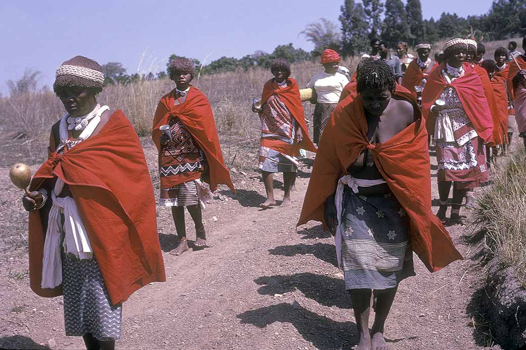 Senior “tangoma” are leading initiates to the river to the sound of drums and rattles, playing the rhythm of the “emaNdzawe” (or Ndau, a tribe in Mozambique that had been killed by the Swazi in the 19th century) for the rituals in which they will be immersed in water.