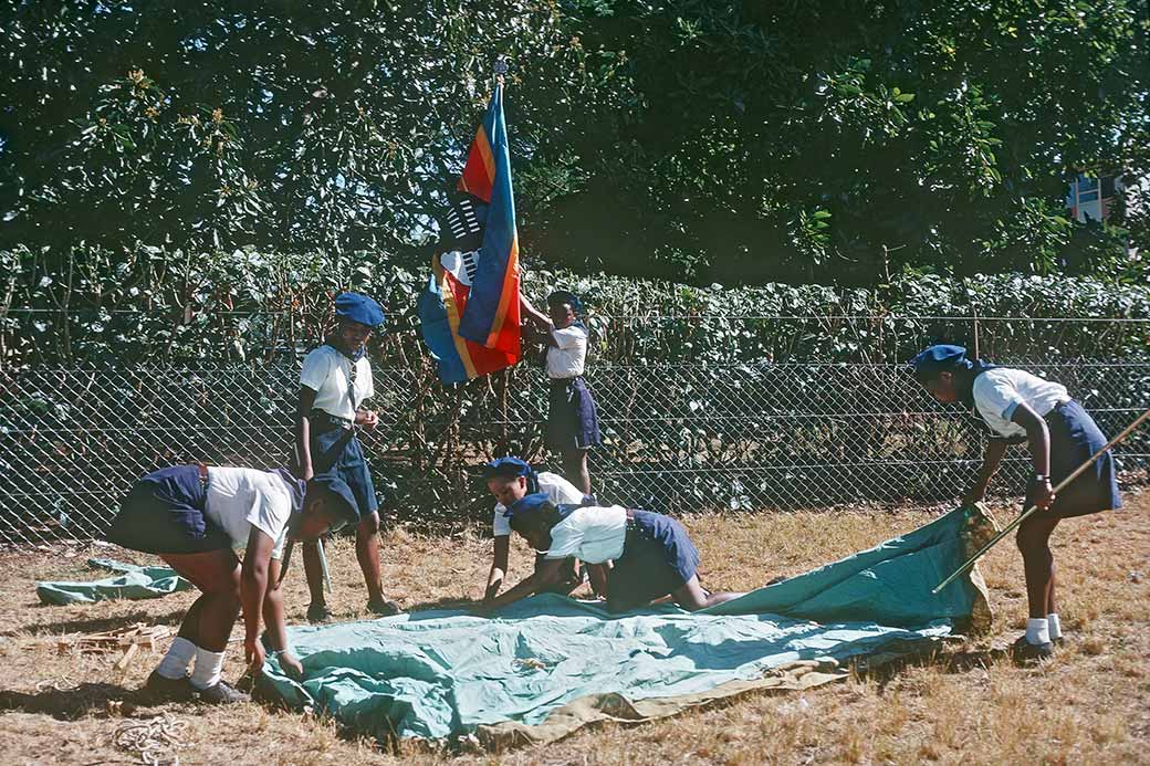 “Rangers”, girls of St. Theresa School in Manzini, putting up a tent; Swaziland's flag is held aloft.