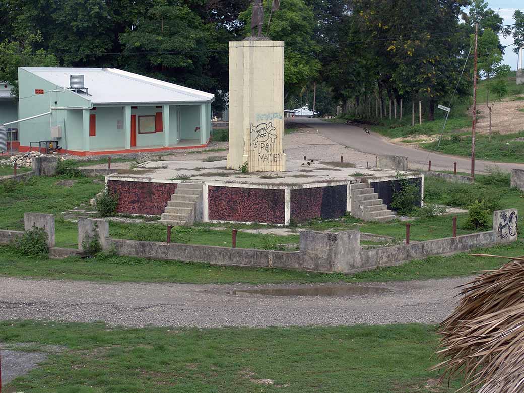 The “Australian Flag House”, the house where the “Balibo Five”, journalists who were killed by the Indonesian army when they invaded in 1975. In a futile attempt to escape this fate they had painted an Australian flag on the wall. In 2003 the house was restored as a community centre, financed by the state of Victoria; it was attempted to preserve the painted flag by a plate of glass; (it is very faint). In the foreground a decaying Indonesian “Integrasi” monument.