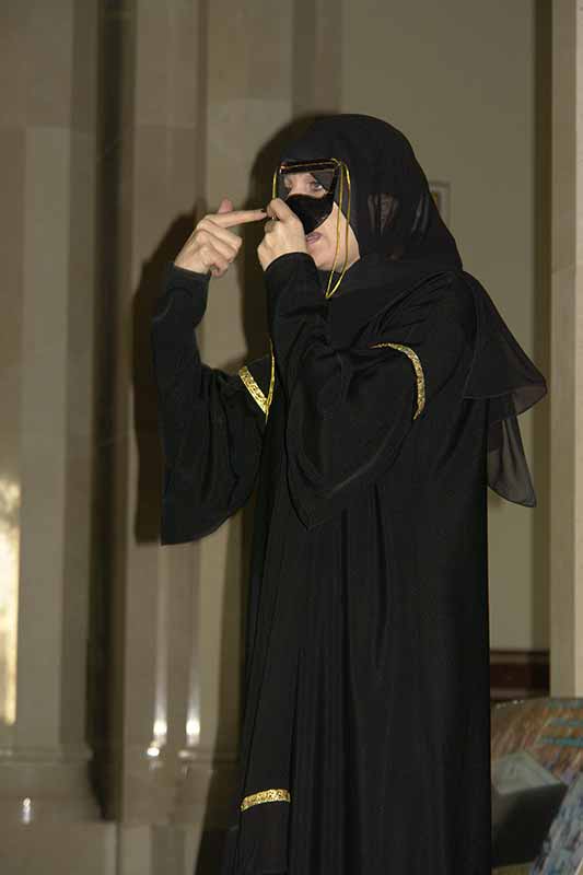 Latifa, a British volunteer and convert, demonstrates the the “batula”, the canvas face covering worn by some Muslim women, in the Jumeirah Mosque for a group of tourists.